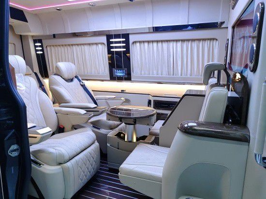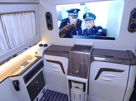 随车自带的咖啡机、车载冰箱、酒·柜,贵宾接待时更添一份待客之道,也为个人出行时多一丝休闲之享,奔驰斯宾特商务车自带可升降的40寸液晶电视、整车环绕音响以及后舱DVD影碟机,无论是商务接待时播放公司介绍或产品型号,或是家庭出行时播放电影音乐,都是绝佳的选择。