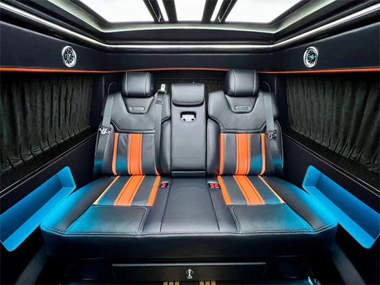 第二排搭载的是两张航空头等舱座椅,拥有12项电动调节,通风加热按摩脚托腰托甚至是座椅上下调节都应有尽有,地板部分采用的是碳纤维风格地板,档次十足,顶部有一个定制的顶灯,它有三款颜色可以随意的切换,适用于不同的车内场景,展现出不同的氛围感。车内总体空间感十分宽敞,适用于商务接待或家庭旅行。