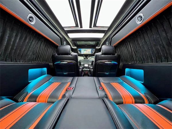 顶部半隔断的车载无线网络电视机,全车10个进口BO音响系统,再配合顶部天窗和后部的三色宫格顶灯相结合,搭配整车的线条式氛围灯,凸显整车的层次感,也烘托了整体的氛围。地板部分采用的是碳纤维风格的地板,档次十足。车内总体空间感十分宽敞,适用于商务接待或家庭旅行。