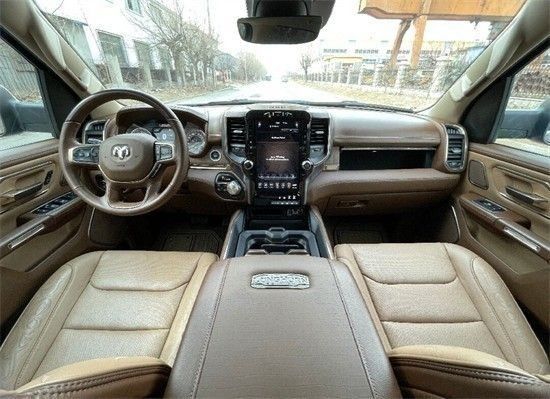 道奇公羊内部设计上还是延续了美式那种比较粗犷的风格,规整的中控台设计看上去比较死板,但丰富的配置会让你不由得为其称赞,中控台的设计简洁硬派,符合公羊的气质,仪表盘底边有花纹,则更加凸显了这款车的文雅性,软性材质的仪表台设计,摸上去手感非常舒服,并无些许生硬之处。