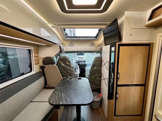 内饰设计上与驾驶室的整体风格是非常一致的,总体的色调也是选择了较为明亮的橙色与白色搭配,内饰看上去舒服不压抑。会客区采用L型卡座设计,适合与中短途的旅行的露营,是更适合于追求品质生活。