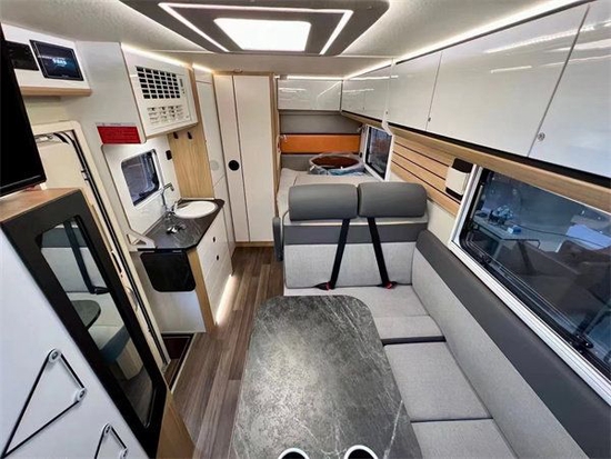 会客区为了打造舒适便利的车内休憩区,采用L型沙发座椅设计,空间利用率更高。除此之外,还配备可升降式餐桌,不仅能满足用餐需求,降下后更可拼成一张尺寸可观的沙发床。此外,沙发内侧墙壁还设计有外推窗和储物柜,可方便储存生活用品。更令人惊喜的是,车顶还配备了氛围灯,为休憩区烘托了温馨的氛围。
