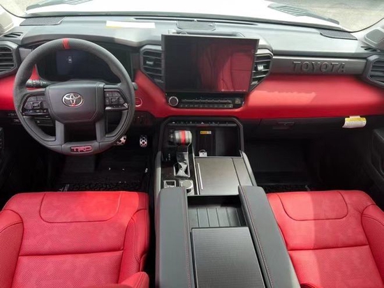 23款丰田红杉的内饰的实用性与空间利用率在这代红杉身上均得到提升,坐进车内,第一感受就是大,前排的两个大尺寸的真皮座椅,自带打孔透气皮料,四幅式多功能方向盘,握在手里的质感不错,转向也没有想象那么重,T型的中控平台,尺寸方面也比一般车型大不少,14英寸的中控触摸屏,集成了几乎所有的影音娱乐以及车身控制功能。