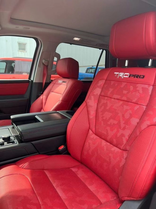 详细配置看这里《2023款丰田红杉3.5T TRD Pro 配置:天窗,智能卡、前后挡泥板、FORCEMA发动机罩徽章、半智能雨刷、黑色电动折叠后视镜、后视镜加热、黑色车顶、鲨鱼鳍天线、黑色行李架、单排气管、全车LED灯、滑动天窗、电子油门、12V辅助电源;前排座椅加热、可调节腰部支撑、三排快捷进入、环车影像、12.3寸仪表盘、三区空调、隔音挡风玻璃、隐私玻璃、翻转后窗、中控台真皮、换挡旋钮、真皮多功能方向盘、8寸音频触摸屏、胎压监测、前排头枕、巡航定速、车道跟随、自动远光、8气囊、盲点辅助、前后驻车辅助系统、10速变速箱、独立双簧臂、前悬架螺旋弹簧、多连杆后悬架、全尺寸备胎、灰色水平格栅(镀铬镶边)、镀铬SEQUOIA徽章、LTD门徽章、断面镀铬车顶、栏杆彩色外镜盖、前排座椅通风、三排座椅电动、主驾驶座椅记忆、手动二三排遮阳帘、储物箱照明、14寸触摸屏、方向盘加热、网眼格栅(镀铬镶边)、亮黑SEQUOIA徽章LTD门徽章、彩色门把手、深黑色镀铬行李架、顺序转向尾灯、LED智能大灯(自动开关,调平)、座椅对比线缝、机长座椅、后视镜罗盘、无线充电、副驾驶仪表、铂金徽章、JBL音响、10寸抬头显示、自适应悬挂、18寸TRD Pro专属亚光轮毂、黑色丰田传统格栅、TRD Pro灯条套件、24小时尊享专线[150 2254 9999(同微信 孙经理)为您讲解]机盖TRD Pro灯、双排气、红色弹簧、红色稳定杆、黑色大灯装饰、TRD Pro全气候脚垫、铝制运动踏板、红色一键启动按钮、红色换挡旋钮、8+2前排电动座椅、TRD Pro仪表盘徽章、后电子差速器、地形反馈、TRD Pro越野悬架、TRD Pro前稳定杆、多路况模式。