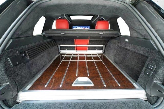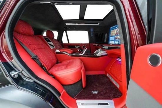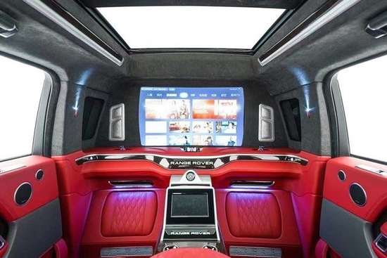 新款路虎皇家一号、内饰方面,新车依旧采用和外观同样的黑色和酒红色的双色拼接,中控区配备有大尺寸的液晶屏、四辐式多功能方向盘等等,新车还首次采用了隔断的设计,还有配有小桌板、座椅按摩以及超大尺寸的全景天窗等等,高档感十足,这样的内饰设计也是把该车显得极为科幻富有未来感。