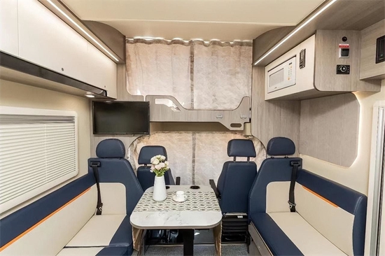会客区对座沙发坐垫及靠背均十分厚实。餐桌具备气动升降功能,以满足临时躺卧休息的需求。墙壁上的通风窗配有隐私拉帘,上方设有吊柜,具备充足的储物空间。厨房区域带有900w的电磁炉,220V额微波炉,不锈钢水盆和水龙头都是标配,水盆带盖设计。148升的超大容积冰箱,另外还有85升,90升,152升的不同冰箱可以选配。