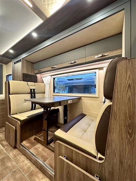 会客区采用经典的四人对坐卡座样式,超大外推窗,增加了自然光照入车内的面积,座椅的上方有丰富的储物空间。升降桌降下与对坐沙发可以拼成一张1900*945(mm)的临时床位。