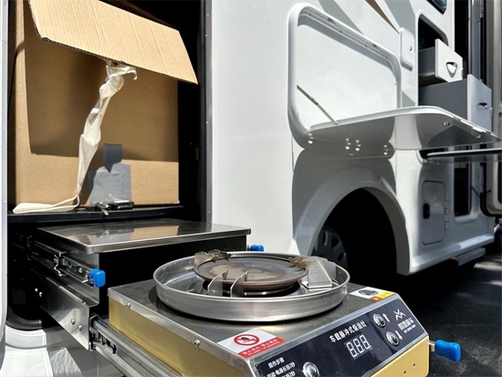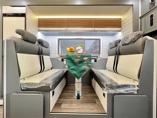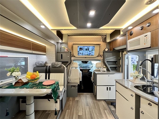 内饰布局采用C型房车常见的左侧+后侧的双拓展设计,车厢内前部高度为2120mm,拓展后内部尺寸宽阔。内饰采用欧洲工艺家具设计,整体选用免漆家具板+进口地板革+防火板台面等,旨在最大程度塑造家的感觉,保障房车内部高品质的居住使用空间。