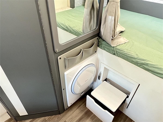 尾部休息区横置一张大尺寸床铺,拓展后空间更宽敞,可以满足多人睡眠休息;床铺车窗、隐私帘、照明灯、电源插座等设施配备齐全,带来舒适贴心的睡眠体验;顶部是一排储物吊柜,侧面还有一个按压式储物柜。卫浴间内部基调与生活区保持一致,实木地板、大理石纹台面起到了带动氛围的作用。配置上,卫浴间提供游艇陶瓷电动粉碎马桶、陶瓷洗手池、化妆镜、淋浴花洒等。卫浴间还提供1500W 6.6L电热水器作为热水供应。水电配备300L净水箱、45L灰水箱、80L黑水箱、48V 250Ah锂电、48V 4000VA充逆变一体器、1200W硬板太阳能供电系统等,解决了户外旅行水电的问题。总体来看,戴德新款E途SE房车的各方面表现都非常出色,车型的亮点也非常突出,尾部的超大户外厨房、车内会客厅的可拓展设计和尾床下方的折叠式踏步,设计实用方便,让旅行生活更贴心舒适。