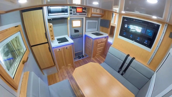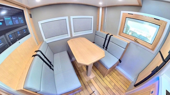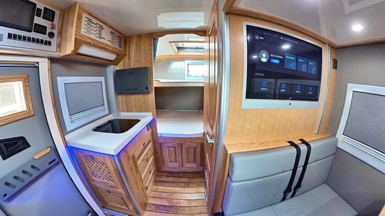 在会客区上方,安装有吸顶式储物柜加一台内嵌式行/驻车两用的格力变频空调,沙发座椅后方固定有32寸飞利浦液晶电视+日本YAMAHA八喇叭音响系统,内侧墙壁配备两扇通风观景窗,在底部则安装有特鲁玛 COMBI 燃油暖风热水一体机取暖出风口和220V电源插座等设备。值得注意的是,会客区与驾驶舱中间并没有采用封闭式设计,设有一张可开启式互动窗,以便前后观察和交流使用。