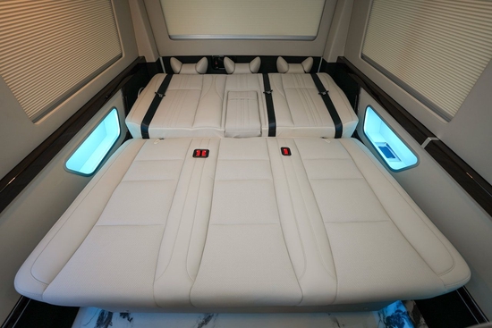 丰田海狮内饰4把航空座椅(通风,加热,按摩,电动调节后背,旋转座椅,腿托,北京东方众威汽车销售原创座椅前后电动动,纳帕真皮)沙发床(纳帕皮,靠背前后电动调节,前后电动调节)侧壁窗帘造型,氛围灯,侧壁地脚线,软包,镀铬套件,C柱壁灯,230V电源USB插口,侧壁桃木。