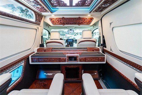 丰田海狮整车升级了加强型的隔音隔热处理,车内带空气净化系统,无线充电系统。在进门侧加装了氧化铝脚踏带迎宾灯的,整车都是采用纳帕级皮质进行包覆的,侧壁桃木装饰,手动百褶窗帘,后舱暖风系统,最后说说棚顶灯光,这个有智能触摸控制系统。灯光超级棒。