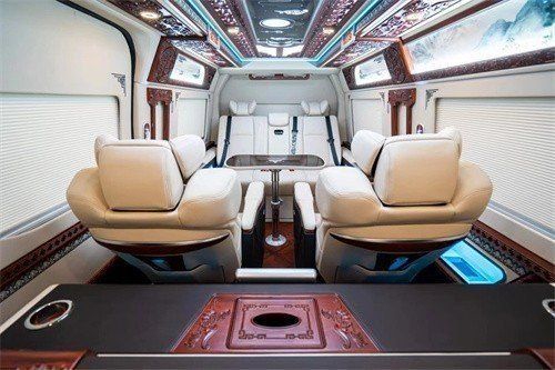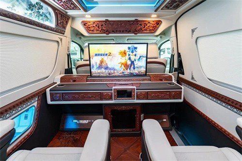 丰田(进口)海狮-HIACE驾驶舱升级9寸导航,搭配360度全车影像,桃木方向盘,升级了原厂桃木纹内饰改为进口豪华感顿显。主副驾驶座椅真皮包覆,主副驾驶座椅四向电动调节带通风加热,主副驾驶中间升级车载扶手冰箱。丰田(进口)海狮-HIACE主副驾驶后面,加装了24寸高清液晶电视娱乐系统,全车升级阿尔派音响系统。