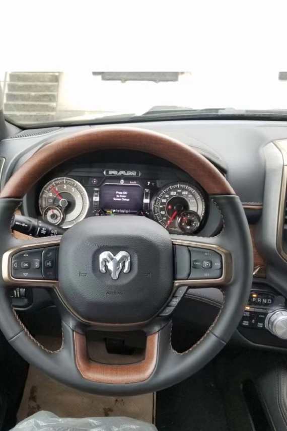 道奇公羊长角号皮卡在内部设计上还是延续了美式那种比较粗犷的风格,规整的做工用料看上去就非常有质感,丰富的配置会让你不由得为其称赞,中控台的设计简洁硬派,符合公羊的气质,仪表盘底边有花纹,则更加凸显了这款车的文雅性,软性材质的仪表台设计,摸上去手感非常舒服,并无些许生硬之处。