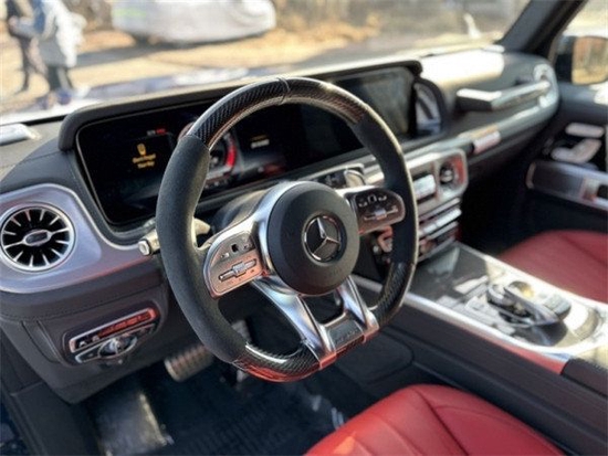 2023款奔驰G63豪华精致的真皮包覆提供了足够的舒适性和支撑性,通风和加热功能让乘客免受高温和寒冷的煎熬。中控台多处均采用碳纤维材料覆盖,带彩色TFT显示屏的AMG仪表盘、AMG主菜单和单独的挡位显示器以及采用白色照明的AMG门槛。名贵的选材及精湛的内装令人拍案叫绝。