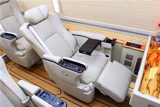 丰田考斯特内饰设计可满足客户的高品质需求,全车加装了航空座椅,首长席办公桌,高密度阻燃地毯,华通丰业还搭载了全新顶灯,能给客户带来不同寻常的舒适体验。因此,无论是商务需求亦或是家庭旅行,创新概念改装商务车丰田考斯特,都能使的客户感到非常满意。