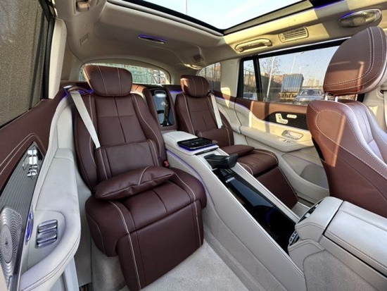 23款迈巴赫GLS600 (配置|询价)(配置|询价)排双独立行政座椅,椅背倾斜角度最高可达43.5度,后排腿部空间最大可达1.34米,带来头等舱级乘坐体验的同时,车内还放置了冷藏箱以及梅赛德斯-迈巴赫原装银色香槟高脚杯此外,梅赛德斯-迈巴赫GLS (配置|询价)(配置|询价)600 4MATIC搭载4.0升V8发动机与48伏智能电机,百公里加速时间仅为4.9秒。