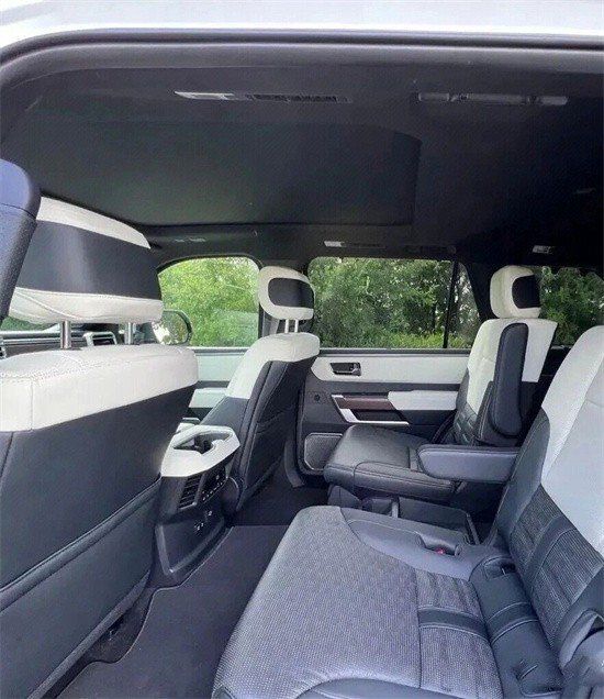 23款丰田红杉车内采用了大量软质材料包裹,部分区域还加入了缝线处理,显得档次感和质感十足。另外车内采用的是四辐式多功能方向盘,并保留了很多物理按键,足以满足驾驶时想要的操控感,车内的科技氛围是通过12.3英寸的全液晶仪表盘和14英寸的中控屏来实现的,中控屏两侧的空调出风口,虽然没有采用时下流行的贯通式设计,但在中控台上对称排列也别有一番风味。另外顶配Capstone车型的内饰将会采用更加豪华的黑白配色方案,并搭配胡桃木装饰面板。