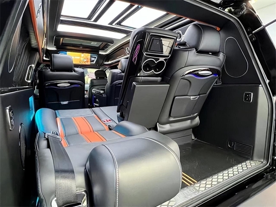 两个独立的航空头等舱按摩座椅,配有通风、加热、按摩等十二项电动调节功能,让我们在乘坐过程中有舒适的乘坐体验。顶部半隔断的车载无线网络电视机,全车10个进口BO音响系统,再配合顶部天窗和后部的三色宫格顶灯相结合,搭配整车的线条式氛围灯,凸显整车的层次感,也烘托了整体的氛围。地板部分采用的是碳纤维风格的地板,档次十足。