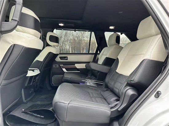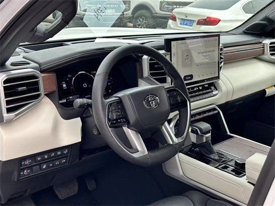 23款丰田红杉车内采用了大量软质材料包裹,部分区域还加入了缝线处理,显得档次感和质感十足。另外车内采用的是四辐式多功能方向盘,并保留了很多物理按键,足以满足驾驶时想要的操控感,车内的科技氛围是通过12.3英寸的全液晶仪表盘和14英寸的中控屏来实现的,中控屏两侧的空调出风口,虽然没有采用时下流行的贯通式设计,但在中控台上对称排列也别有一番风味。另外顶配Capstone车型的内饰将会采用更加豪华的黑白配色方案,并搭配胡桃木装饰面板。