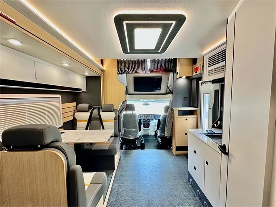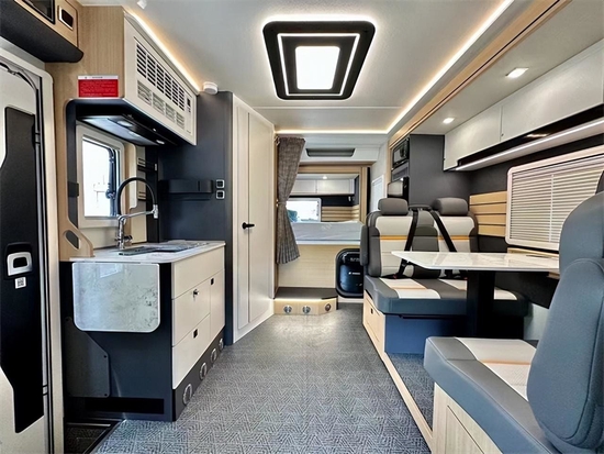 来到车内,这台车是达到母婴级标准健康环保房车”。大人小孩都可以畅快呼吸,会客区域环型卡座,可以乘坐4人,座椅蓝白配色,气动升降餐桌,四向滑移,降下可拼床,客厅还配有24寸液晶电视,脚下石英砂地板革,防滑耐磨。