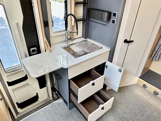 厨房区台面设有翻折式延长桌板以及三合一水龙头,让你烹饪更加简单方便。台面内侧安装了双层置物架可以放置一些调料和小型厨具等,台面下方则配备了储物柜可以放置厨具,容量充足且方便拿取。厨房对面配备了148L房车专用空调以及微波炉,让您在旅途中随时都能吃到新鲜热腾腾的食物。