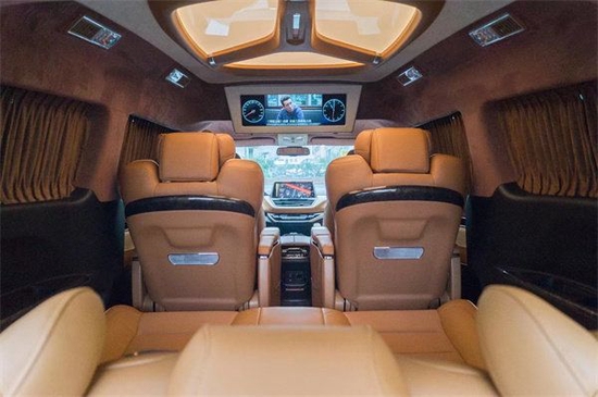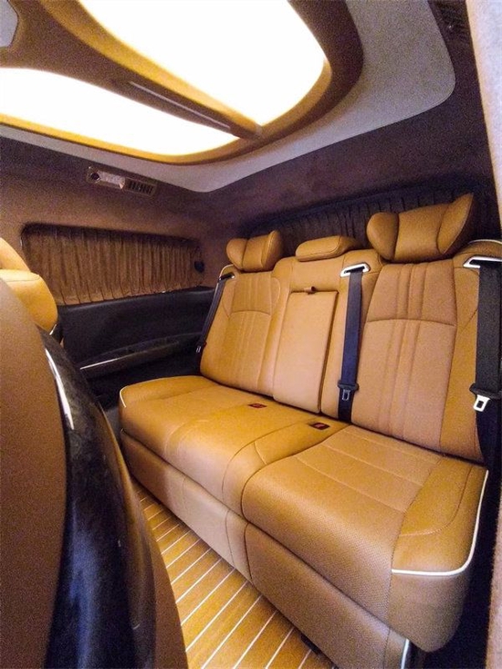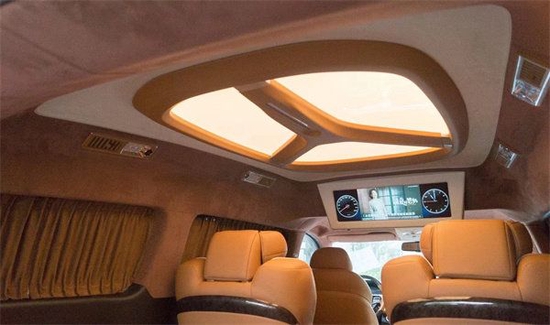 车内顶部为采用的是麂皮绒的软包加上星盾天幕顶灯,除了这些基本的功能性以外,整车在看不到的地方,比如四周全部做了隔音的处理,窗户上都加装的是高级私密窗帘,既可以避免阳光的直接照射,维护车内的一个用车环境,也可以很好的保护我们车主的隐私。