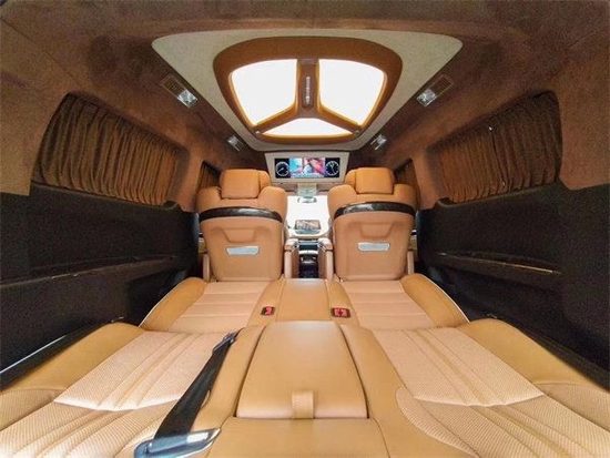 车内顶部为采用的是麂皮绒的软包加上星盾天幕顶灯,除了这些基本的功能性以外,整车在看不到的地方,比如四周全部做了隔音的处理,窗户上都加装的是高级私密窗帘,既可以避免阳光的直接照射,维护车内的一个用车环境,也可以很好的保护我们车主的隐私。