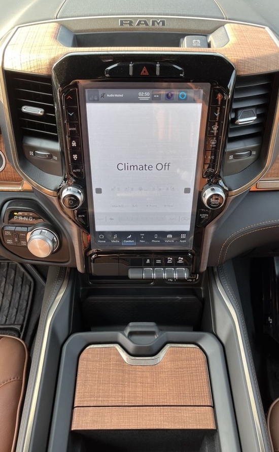 新款道奇公羊中控台的设计简洁硬派,符合公羊的气质,仪表盘底边有花纹,则更加凸显了这款车的文雅性,软性材质的仪表台设计,摸上去手感非常舒服,并无些许生硬之处。