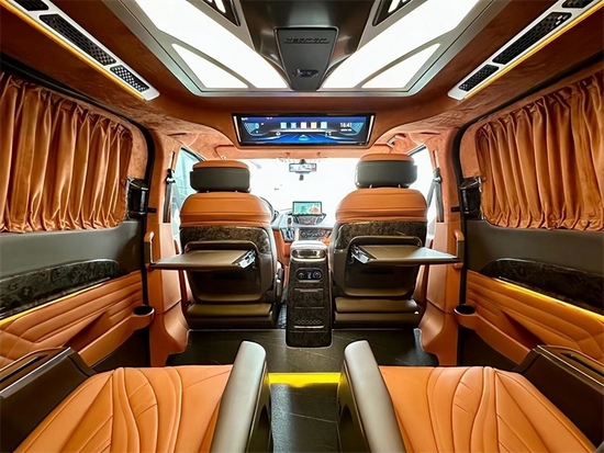商务舱中央两个超级豪华的航空座椅,共有10多项的电子主动调节,还带有腿托通风加热按摩等各种舒适配置。二排的空间可以说是豪华商务的标配,三排升级为一张沙发座椅,支持平躺180度,这使我们在车里休息非常舒适。同时,第二排座椅与第三排座椅旋转,形成对立的卡座,从而形成商业模式;即使用于家庭旅行,也可以增加儿童的娱乐空间。