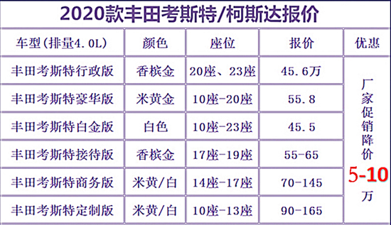 丰田考斯特行政45.6万 4.0排量豪华版53.8万 东方众威原创丰田考斯特9座定制版60万-75万丰田考斯特10座接待版60万-85万 东方众威原创丰田考斯特11座VIP版70万-85万 丰田考斯特16座企业版70万-90万东方众威原创丰田考斯特12座接待版75万-100万 房车_商务车_旅居车_中巴车_改装车_客车_丰田考斯特12座埃尔法 (配置|询价)版80万-110万 东方众威原创丰田考斯特12座定制版90万-140万 丰田考斯特12座蒙娜丽莎版95万-180万全系现车。13911066072汤经理 同微信