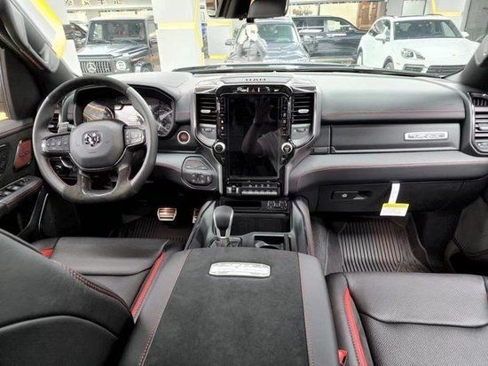 全新道奇霸王龙TRX在内饰部分进一步强化了其高性能版本的形象,中控台和座椅随处可见的TRX标识便是最好的例证。同时,作为道奇家族的旗舰车型,新车还配备了12英寸竖置中控屏幕,除了支持蓝牙、导航和车载Wi-Fi等常见功能,还支持Apple CarPlay和Android Auto手机映射