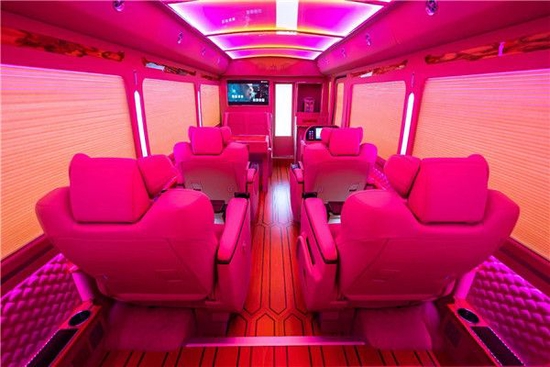 丰田考斯特除了座椅的设置以外,在其他的一些内饰改装上更是别出心裁,在我的眼里,不管是豪华的窗帘还是整齐的地毯,亦或者是我们专门配备的车载冰箱,这一切固然美好,但是都不及丰田考斯特改装在内饰灯光的设计。灯管是最能烘托车内风味的设置,蓝色灯管给人淡雅的感觉,粉色的灯光给人以梦幻,橙色的灯光给人以轻松,丰田考斯特改装商务车在内饰增加彩色的灯光设置,给我们的旅途创造了轻松愉悦的环境。车载冰箱、车载娱乐系统(卡啦ok)、车载液晶卫星电视(可接受200个左右电视频道)。
