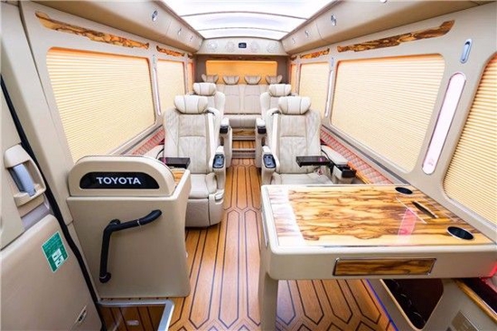 丰田考斯特12座改装商用车在座椅设计上更注重舒适性和昂贵追求,360 可旋转的航空座椅,配备高档办公桌,方便我们的办公和娱乐活动。华通丰业丰田考斯特改装商用车也可以使用完全进口的埃尔法 (配置|询价)座椅,配备通风暖气和电动脚底支撑等设备。为我们的旅行提供一个舒适的环境,减轻旅途中的疲劳。