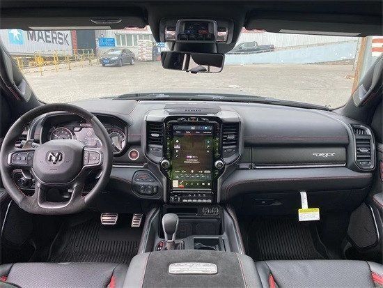 2023款道奇公羊霸王龙从内饰上看,它也毫不逊色。中控部分配备了12英寸竖置中控屏幕,屏幕一横加一竖,按键很齐全,档把也是彰显霸气,手小的可真是不好握,随处可见TRX标识,这样一个庞然大物内饰也是十分潮流的。