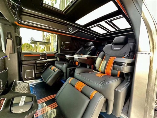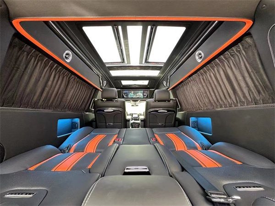 后舱两个独立的航空头等舱按摩座椅,配有通风、加热、按摩等十二项电动调节功能,让我们在乘坐过程中有舒适的乘坐体验。顶部半隔断的车载无线网络电视机,全车10个进口BO音响系统,再配合顶部天窗和后部的三色宫格顶灯相结合,搭配整车的线条式氛围灯,凸显整车的层次感,也烘托了整体的氛围。地板部分采用的是碳纤维风格的地板,档次十足。车内总体空间感十分宽敞,适用于商务接待或家庭旅行。