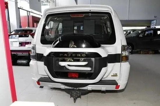尾部造型方面,采用了背负式备胎设计,备胎罩为黑白双拼设计,整体与车身颜色相融合,上方有黄色三菱车标,下方为帕杰罗英文标识,车顶带有大尺寸扰流板,底部带有银色导流槽设计,而且带有黑色拖车勾,实用性很高。