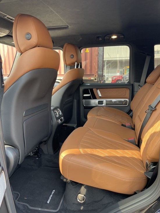 23款奔驰G63AMG后排有独立空调、充电接口、座椅配置了头枕,中央扶手里有杯架。贵宾购车电话:17627885113 祝经理 (微信同电话)后排座椅可以调节靠背角度,也带有加热功能,支持按比例放倒。