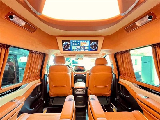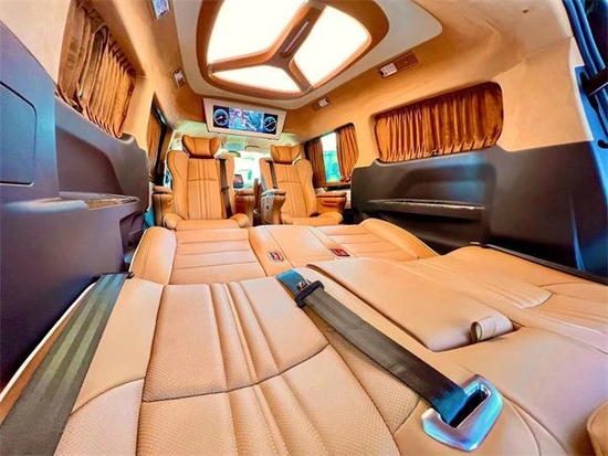 全车采用大量超纤真皮包覆,半隔断互联网电视,加上全车8声道的音箱,带来了很好的视听感受。地板采用大理石纹设计,美观大气,且易打理。中排的采用的是埃尔法 (配置|询价)同款的航空头等舱座椅,功能十分强大,通风,加热,按摩旋转等等应有尽有,这种埃尔法座椅的尺寸比之普通的航空座椅也要宽一点,舒适度更高,坐起来更舒适。