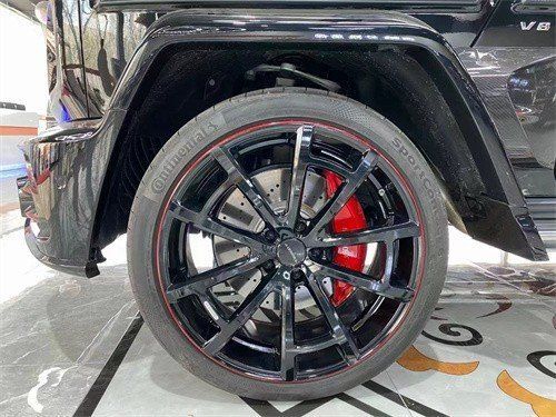 车侧部分,迈莎锐G63基本沿用了奔驰G63的设计风格,24英寸熏黑轮毂搭配红色涂装卡钳设计,及旁出双管排气,散发出十足的性能气息。同时,轮胎、门把手、外后视镜、翼子板还加入了红黑相间的碳纤纹路装饰,相比原厂奔驰G63,迈莎锐G63更具个性,充满视觉张力。