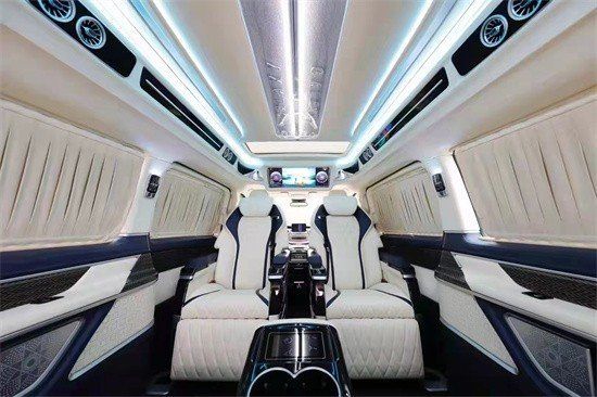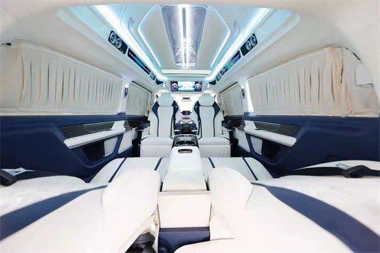 奔驰V250商务车内饰方面同样做了整体的升级,中控台、方向盘、门板、车侧壁、车顶、进门的踏步整体升级包覆。正副驾驶座椅升级包覆、正副驾驶座椅中间加装车载扶手冰箱、正副驾驶座椅头顶定制宽屏车载网络电视、正副驾驶座椅椅背后方加装可伸缩的小桌板。第二排座椅升级成两个独立的航空座椅,航空座椅带多向电动调节功能,带通风、加热、按摩等舒适功能、同时航空座椅还带有选装功能,旋转之后可与第三排座椅形成对坐状态。第三排座椅升级成宽大舒适的三联排沙发床,可电动调节、前后移动,靠背可180度放平平卧。