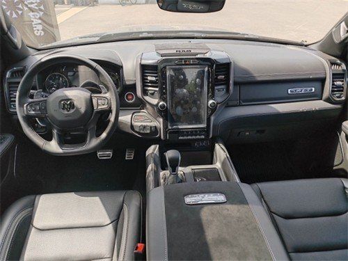2023款道奇霸王龙TRX在内饰部分进一步强化了其高性能版本的形象,中控台和座椅随处可见的TRX标识便是最好的例证。同时,作为道奇家族的旗舰车型,新车还配备了12英寸竖置中控屏幕,除了支持蓝牙、导航和车载Wi-Fi等常见功能,还支持Apple CarPlay和Android Auto手机映射