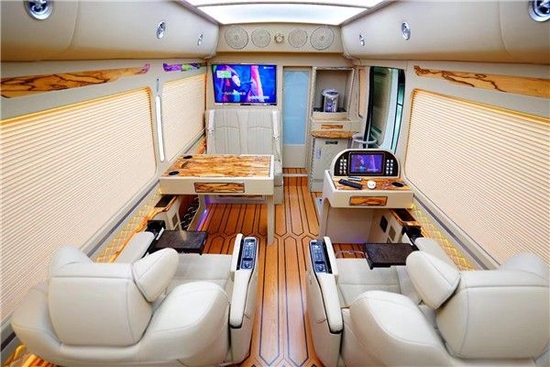 丰田 考斯特车内的窗帘的设计上丰田考斯特也充分考虑了内饰设计的独特性,豪华的布艺窗帘以及大气的电动百褶窗帘, 华通丰业丰田考斯特改装商务车在内饰设计上充分展示出了自己大气的风格设计。