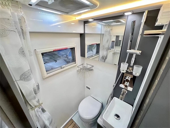 卫生间区域,采用一体式设计,内部还装配有赛特福德进口全尺寸游艇陶瓷电动粉碎马桶、卫生间陶瓷面盆+卫生间独立淋浴花洒、LED高清化妆镜+欧式储物镜柜、换气扇等。固定的洗漱台和陶瓷面盆设计提升内部质感,还有330升保温清水箱+43升保温灰水箱+56升保温黑水箱,旅途过程中能够随心所欲的用水,为车友带来舒适的使用体验。