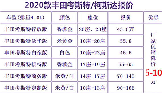 丰田考斯特定位于中型商务中巴车,车身尺寸7005*2040*2760mm,轴距为:3935mm,车身尺寸已经接近于四川一汽丰田考斯特,在同级表现中已经是相当突出。丰田考斯特中巴车更多时候被作为班车或者旅游用车,但是自从丰田考斯特改装创下了一个变装的传奇,丰田考斯特已经成为现在商务用车中接待以及出席活动的最佳选择。