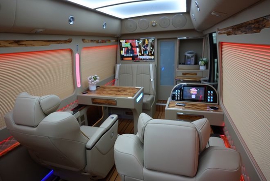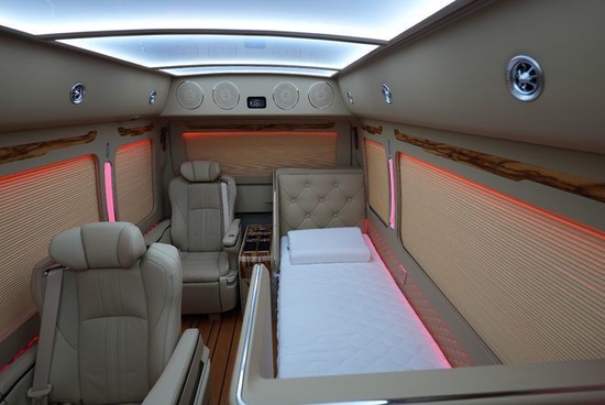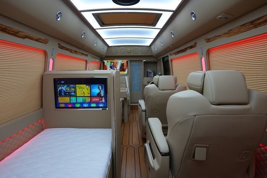 卡拉ok多媒体系统,高清网络电视,5.1声道环绕音箱,电加热烧水壶,50升冷藏冷冻的冰箱。以及豪华办公桌,车顶是a380空客顶,搭配炫彩氛围灯光,全车配备电动私密百褶窗帘。支持一键放平豪华大床。