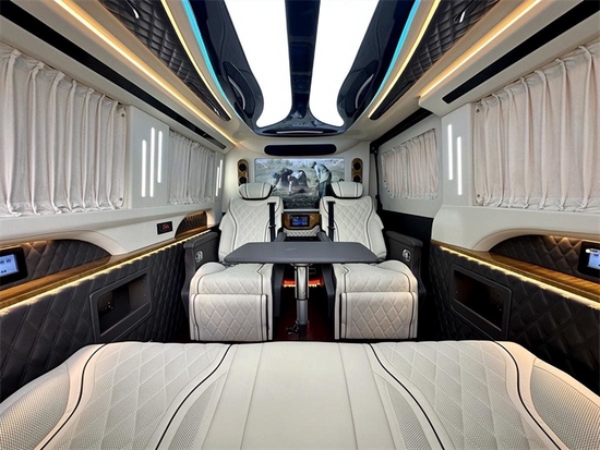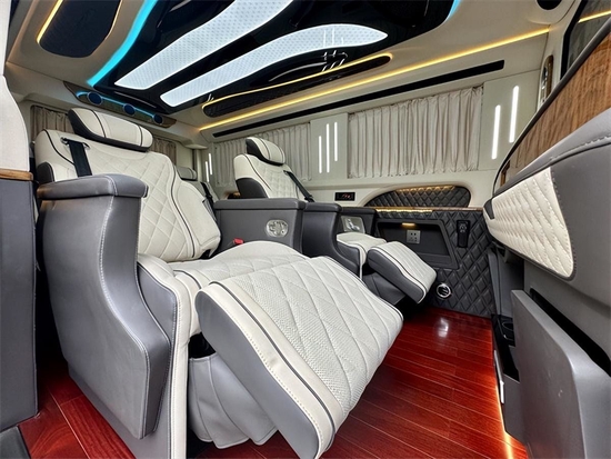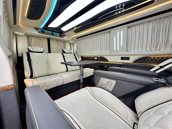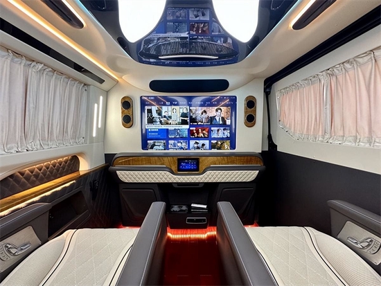 车身尺寸;5963*2010*2660,是一款在车内可以完全站直的车型。后舱五个座椅,由两个航空座椅和三连排的沙发床共同组成。中排两个航空座椅通风按摩加热腿托的功能,全部都是具备。而且座椅都是做了深度的包袱,乘坐的舒适感能够得到很好的体验。