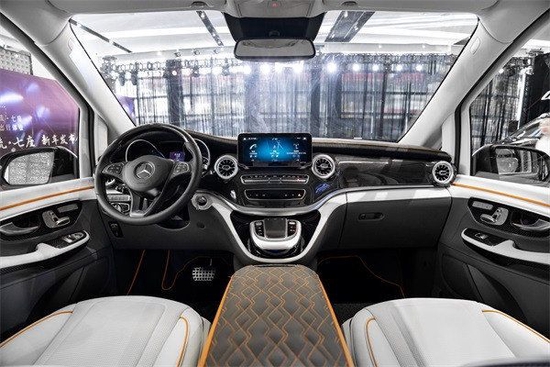 艾奈斯进口奔驰V250商务车进入车内后在仪表台上面我们还能见得到最新的科技材料包覆整个仪表台,可有有效杜绝反光和吸热的问题。车内的所有内饰板材全部采用了碳纤维饰板,将车辆的轻量化做到了最好!