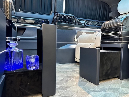 下方吧台不仅具有隐藏电动酒柜以及储物盒,还具有两张隐藏的秘书座可进行一键开启,车内轻松实现会客洽谈并且是对坐的模式,更好的满足交流的互动性。车窗部分深色双层隐私窗帘更好的保障了隐秘的乘车环境。