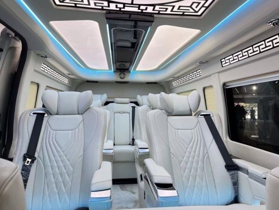 三排是电动沙发床的设计,可以放平睡觉。车侧方还具有全方位的电动百褶隐私窗帘,保证车内环境的隐私性。第二排和第三排的旋转形成一个扩展底座。由于其长度为5.9m,有了更强的空间体验感;让可以在车上款待客户,或与亲友品茶。